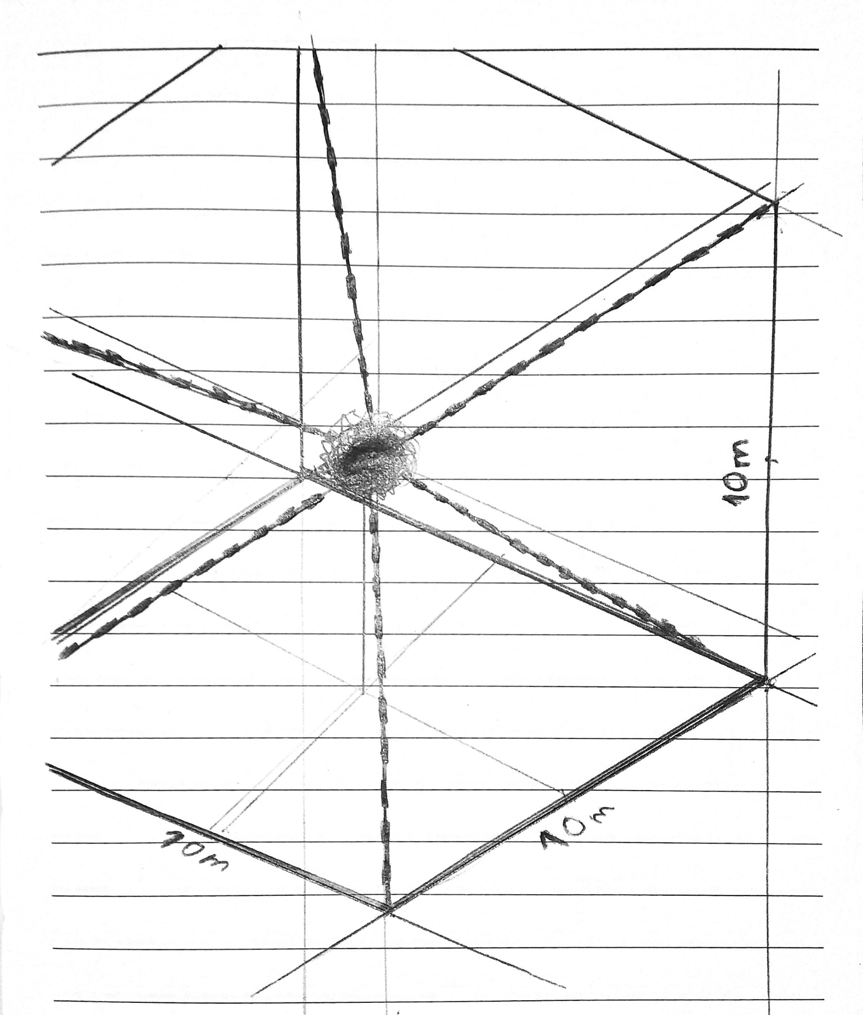 Conceptual sketch of SCP-8192 in containment. Observation window and sealed containment door not included, although they are located on opposite sides. Chains depicted. SCP-8192 not strictly to scale. Drawn by researcher Arabella Maifort.